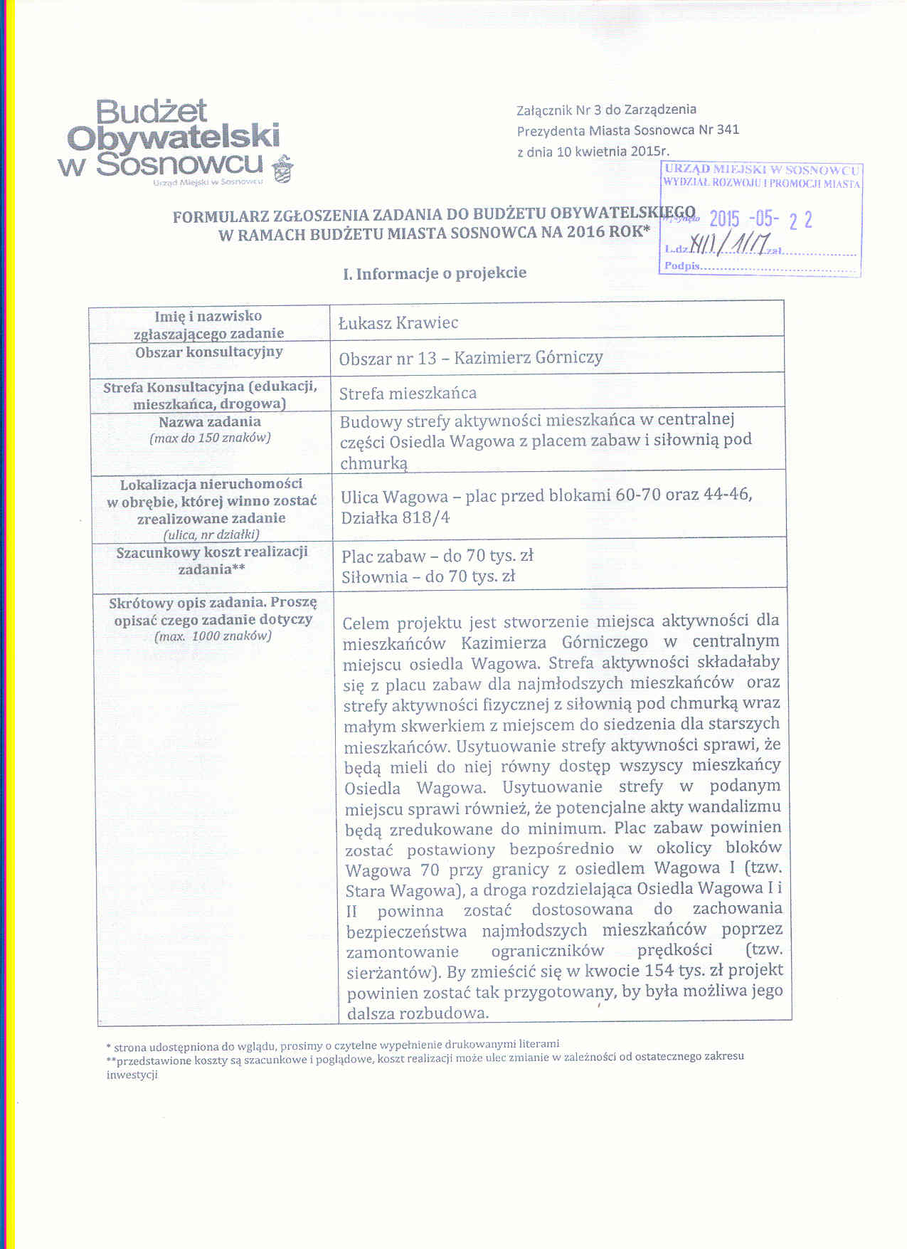 XIII/1/M. Budowa strefy aktywności mieszkańca w centralnej części osiedla Wagowa z placem zabaw i siłownią pod chmurką