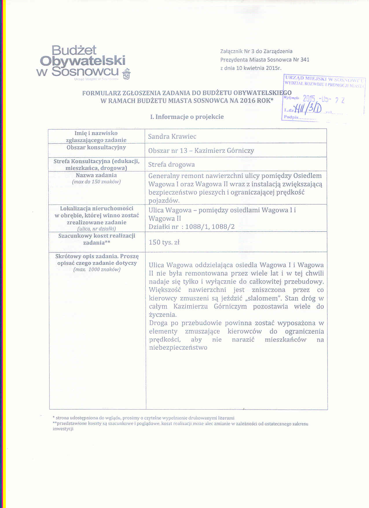 XIII/3/D. Generalny remont nawierzchni ulicy pomiędzy Osiedlem Wagowa I oraz Wagowa II wraz z instalacją zwiększającą bezpieczeństwo pieszych i ograniczającej prędkość pojazdów.